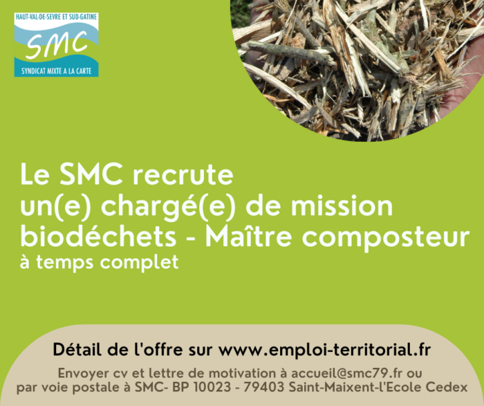 La/le chargé(e) de mission biodéchets a pour mission de poursuivre l’accompagnement des 3 entités (SMC, CCPG et CCVG) dans le déploiement du compostage individuel et partagé, dans le cadre de la stratégie territoriale de gestion des biodéchets. Sensibiliser les élus, le secteur socio professionnel et les habitants du territoire au... Voir l'article