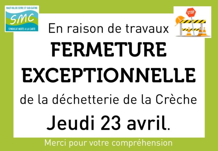 Jeudi 23 avril 2026, la déchetterie de La Crèche sera exceptionnellement fermée en raison de travaux. Durant cette journée, vous pouvez déposer vos déchets dans les autres déchetteries du SMC Retrouvez tous les jours et horaires d’ouverture des déchetteries sur : https://www.smc79.fr/gestion-des-dechets/dechetteries/les-dechetteries/ Merci pour votre compréhension