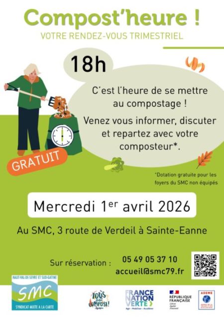 Pour participer à l’atelier Compost’heure, il est nécessaire de s’inscrire auprès du SMC : 05 49 05 37 10 / accueil@smc79.fr / via le lien suivant https://forms.gle/yYS8RpKybuDKxd5r9